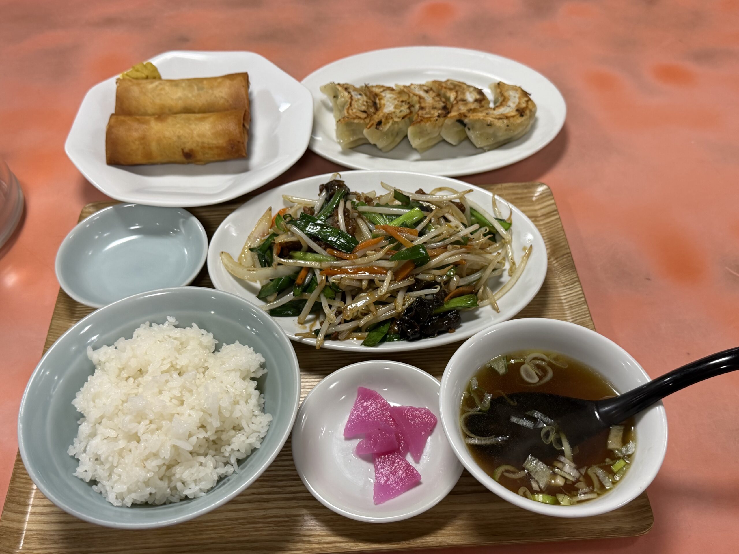 レバニラ定食に餃子と春巻きを注文です
